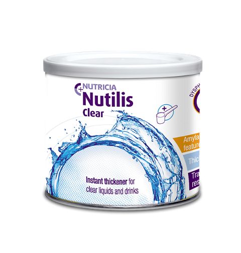 Nutilis clear is a food for special medical purposes for the dietary managementused under medical supervision. Energy 7,5kcal (32,5kj) / 0g protein / 1,5g carbohydrates (0g sugar) / 0g fat / 0,8g fibres / 123g water / 28mg sodium / 30mg potassium / 16mg chloride / 5mg calcium / 0g phosphor / 2,5g magnesium. Nutilis clear is a food for special medical purposes for the dietary management of dysphagia and must be used under medical supervision. Nutilis clear is a xanthan gum based thickening powder designed to maintain the normal appearance of fluids, which may improve patient compliance and hydration. Nutilis clear is gum based so does not immediately break down on contact with saliva giving more time for you to safely swallow.